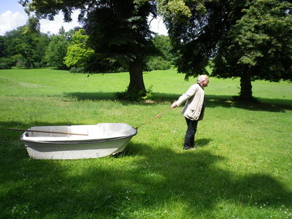 Mensch und Boot an einer Schnur über Wiese ziehend eine Spur erzeugend